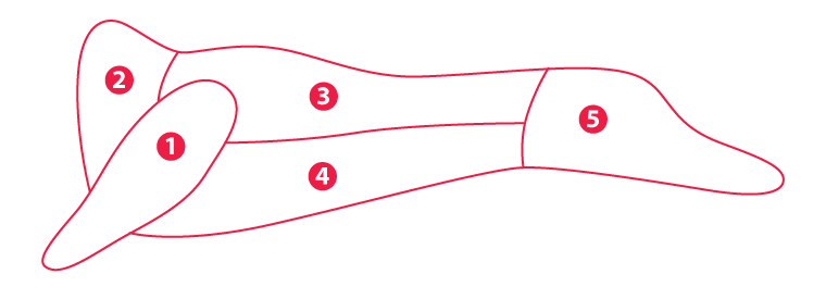 | 2 pav. Stirnos skerdenos pjaustymo schema: 1 – mentė, 2 – kaklas, 3 – nugarinė, 4 – krūtininė, 5 – šlaunis |